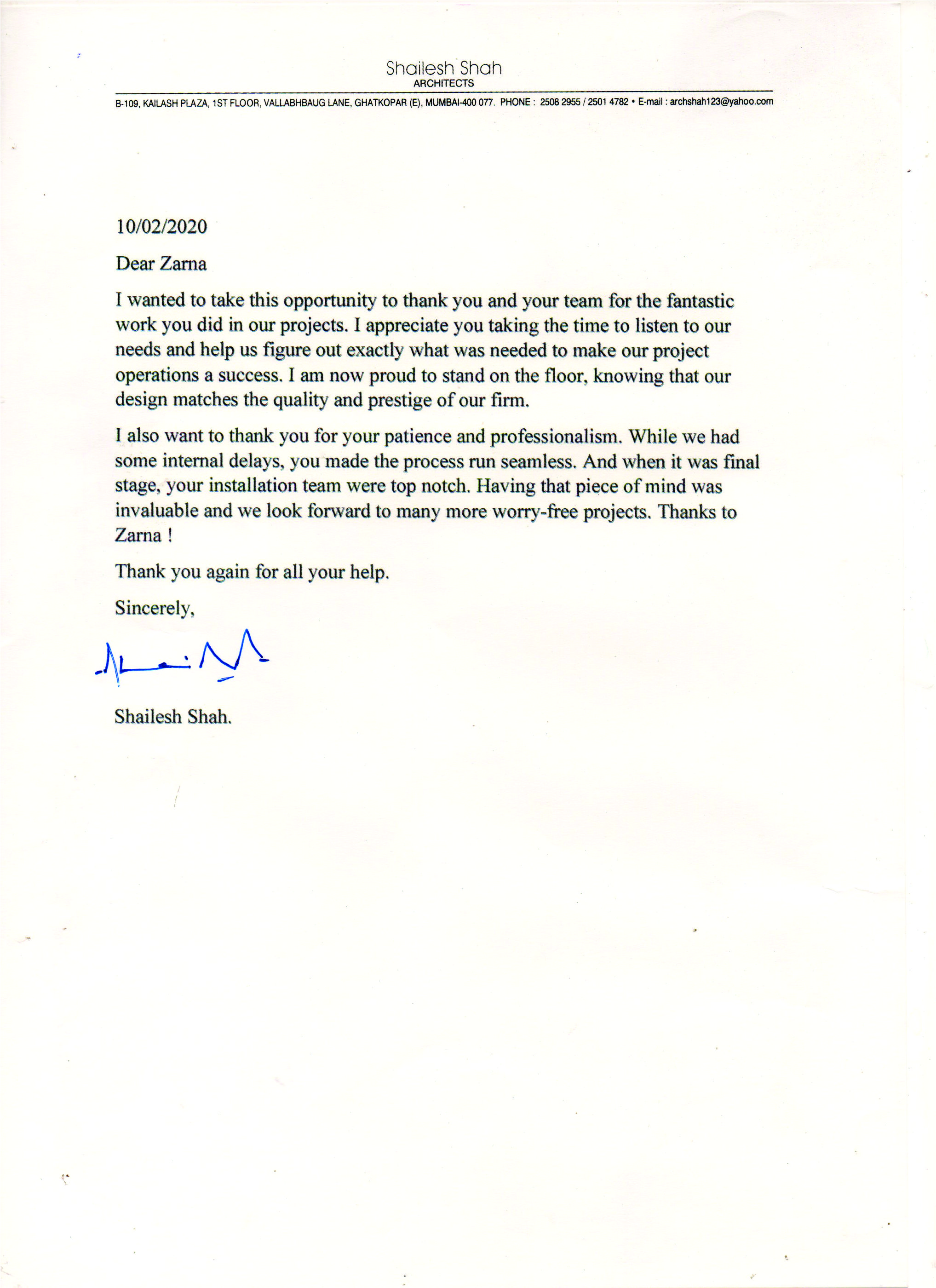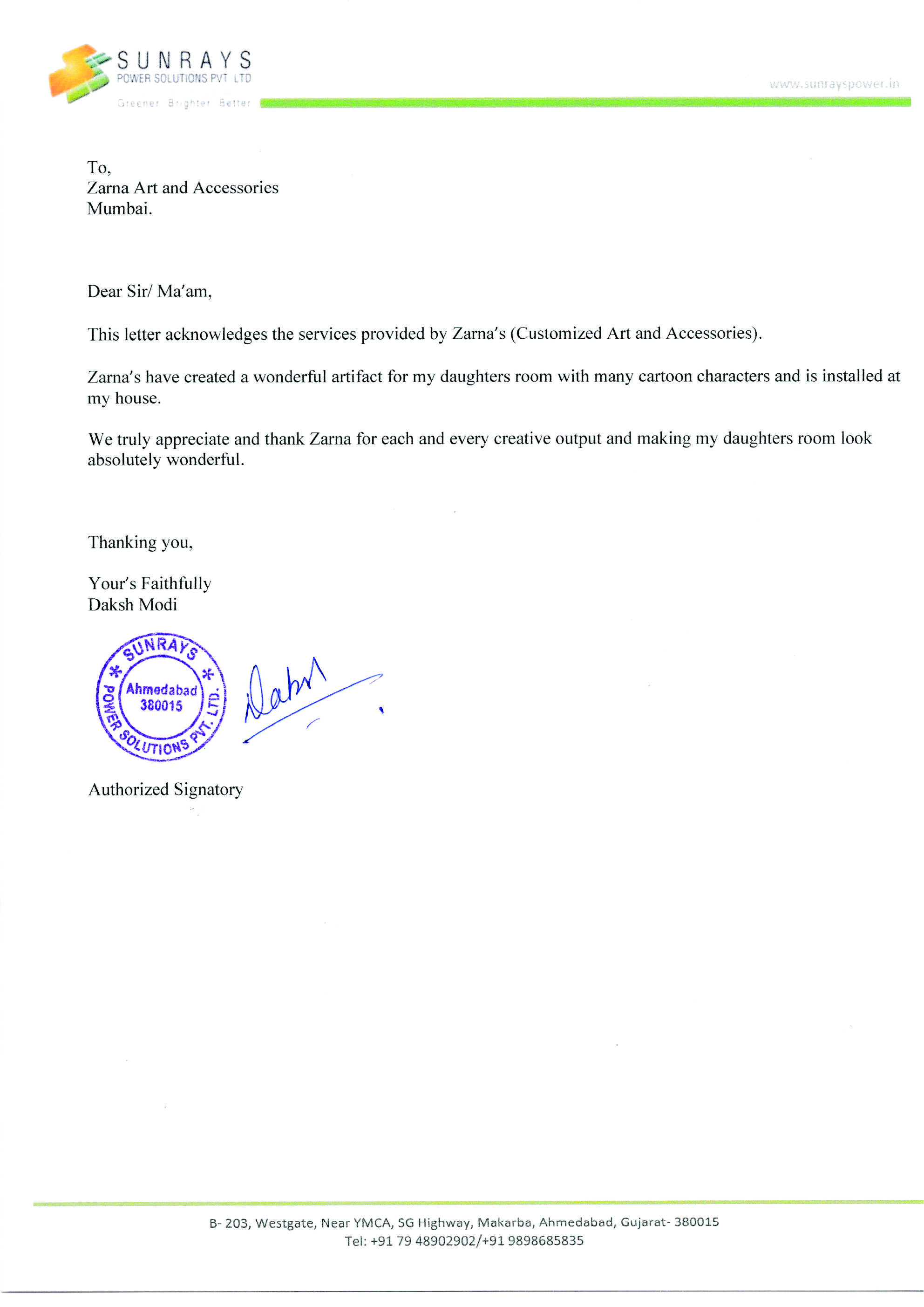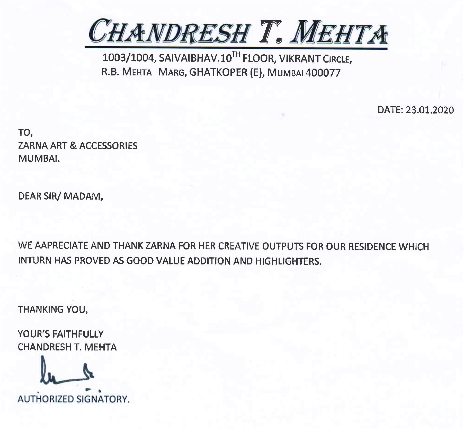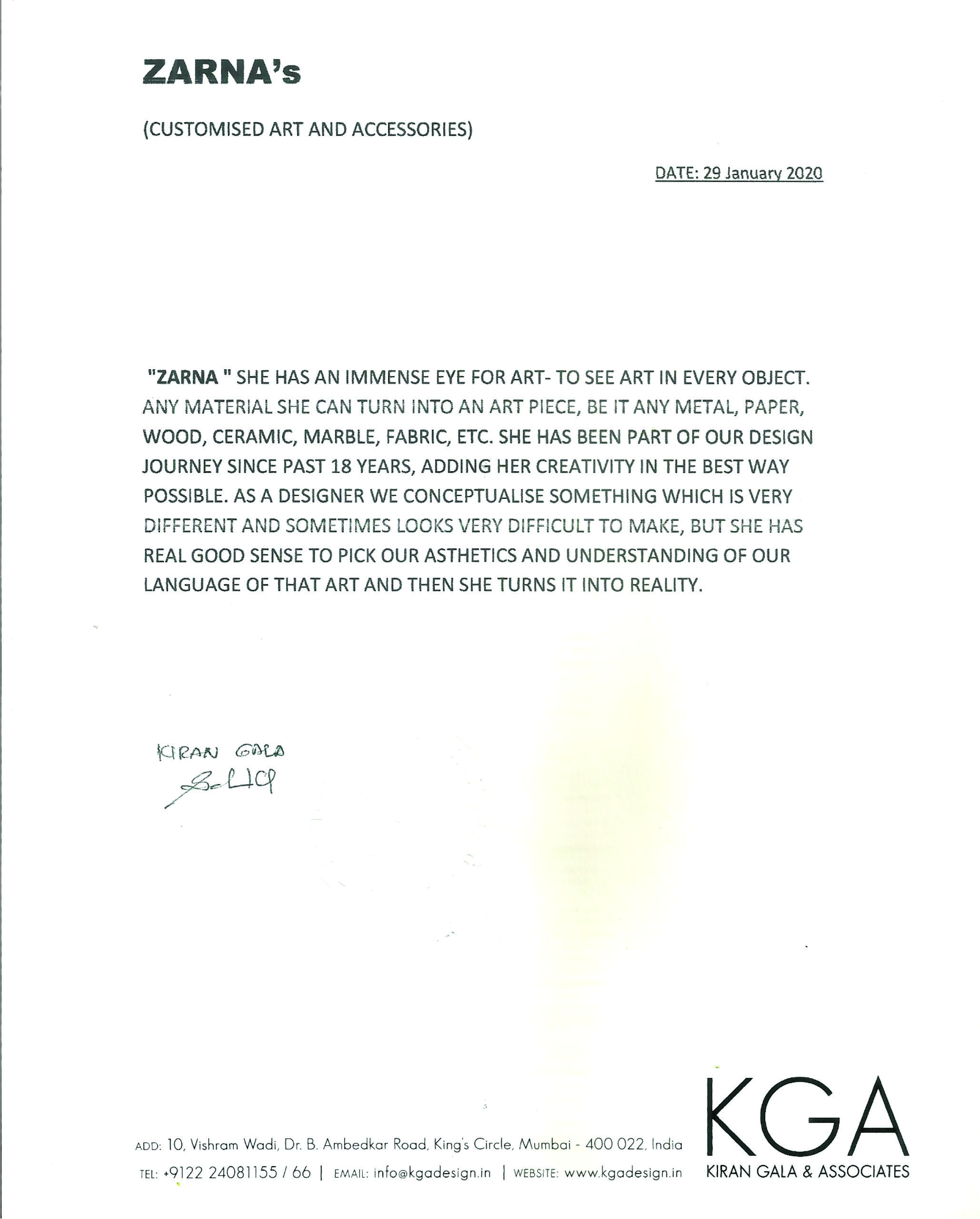 we appreciate and thank Zarna for her creative outputs for our residence.