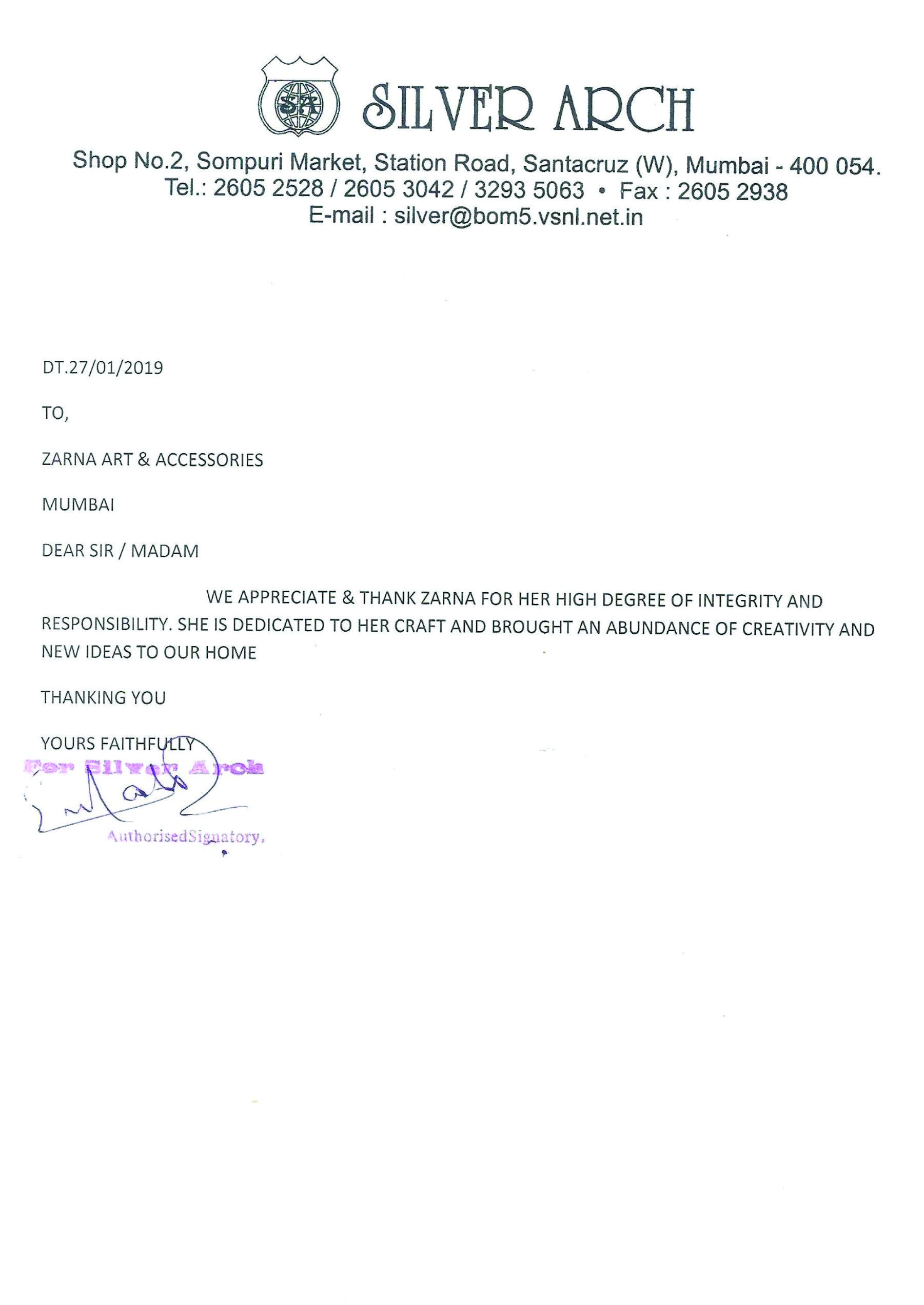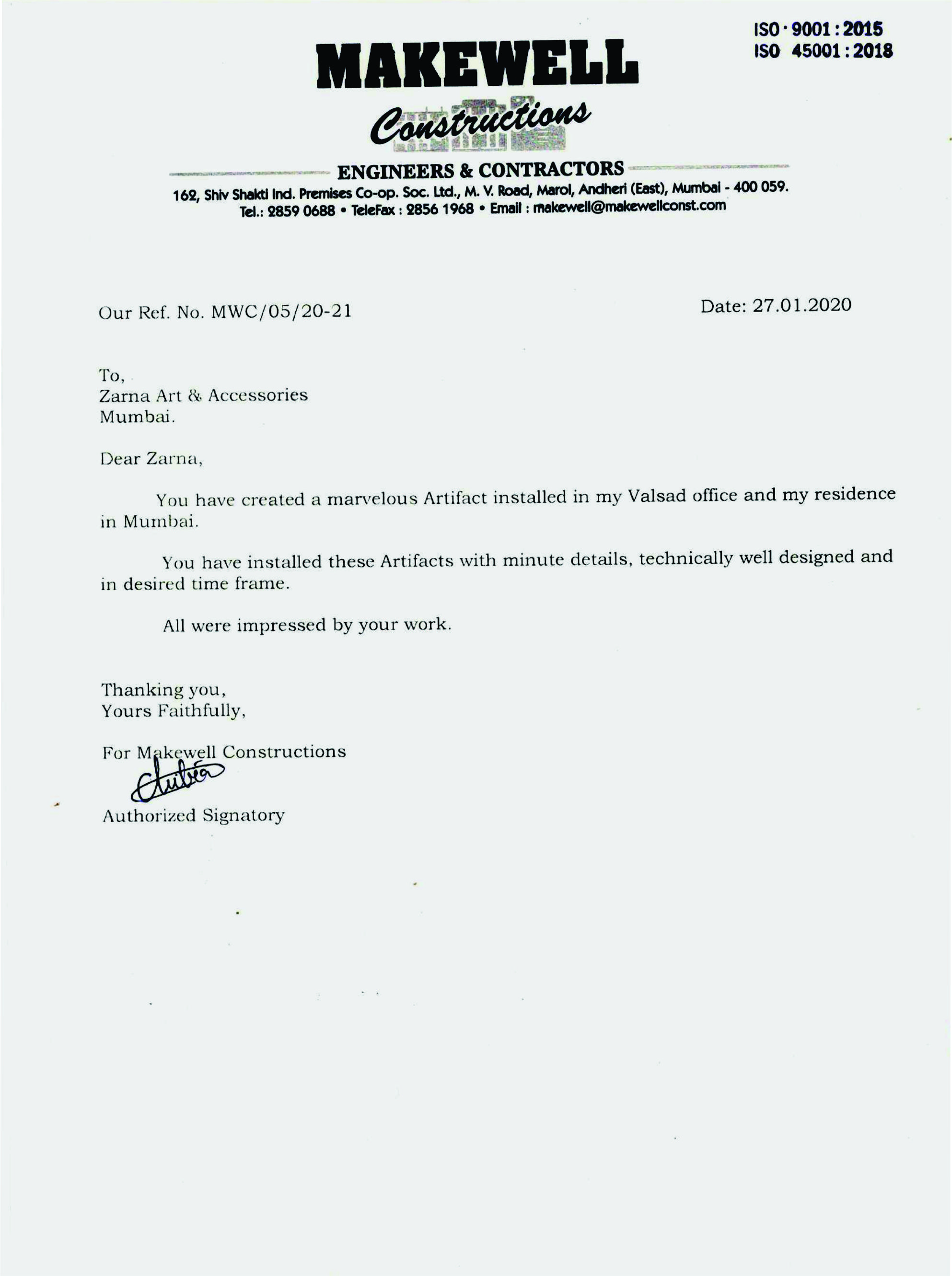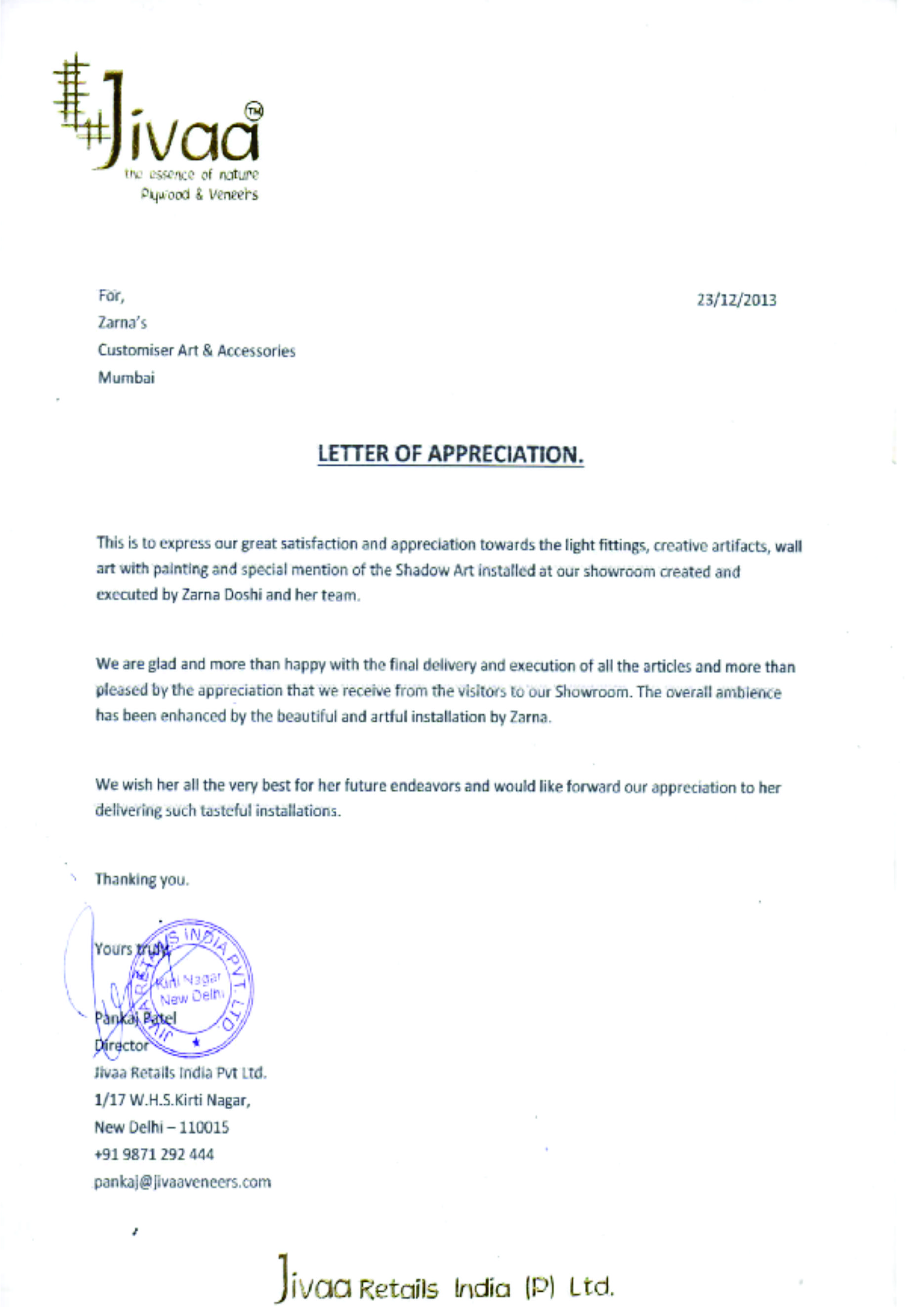 This is to express our great satisfaction and appreciation for ZARNA'S Customised Mirrors done for Encasa which were highly appreciated by our customers also.