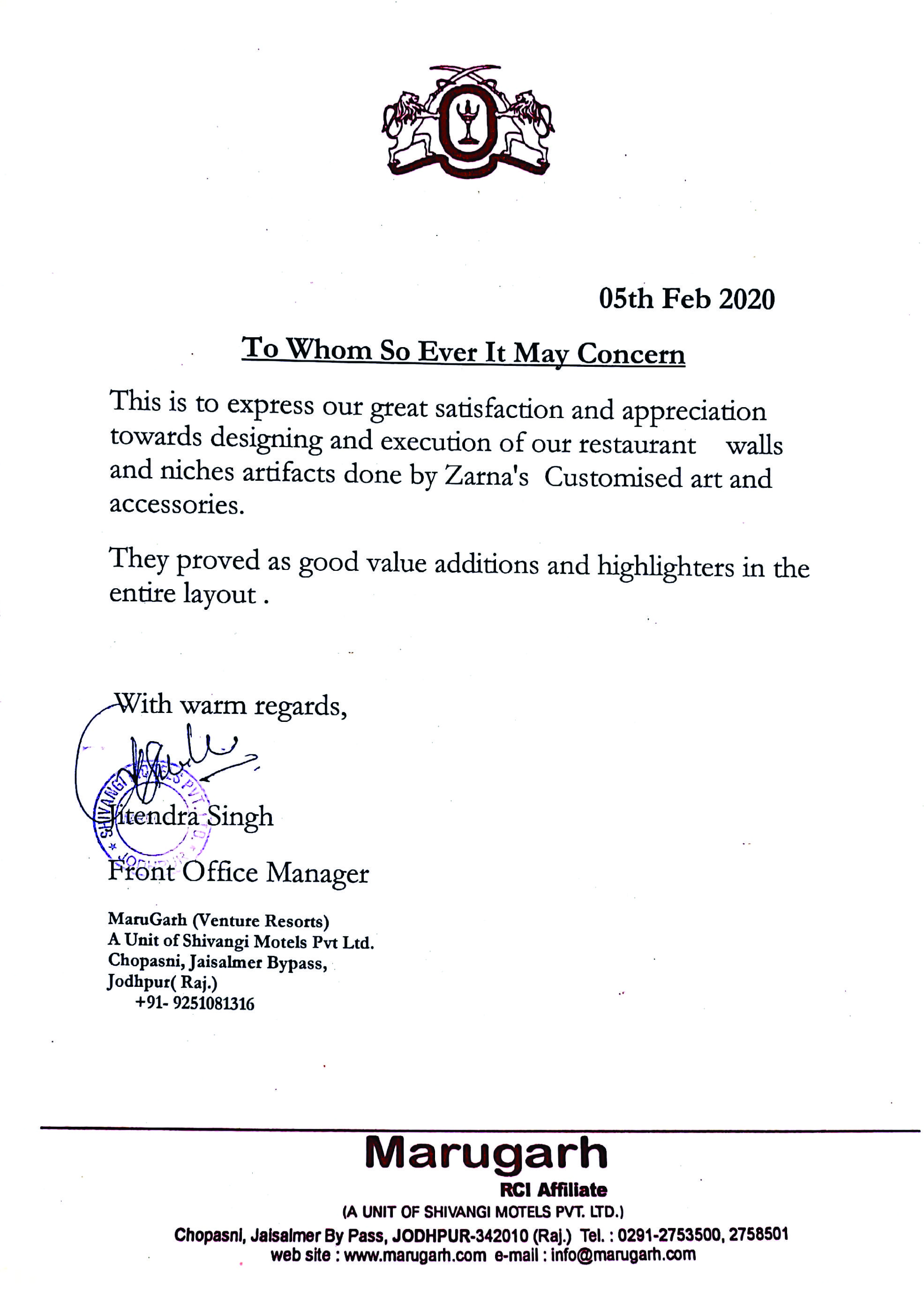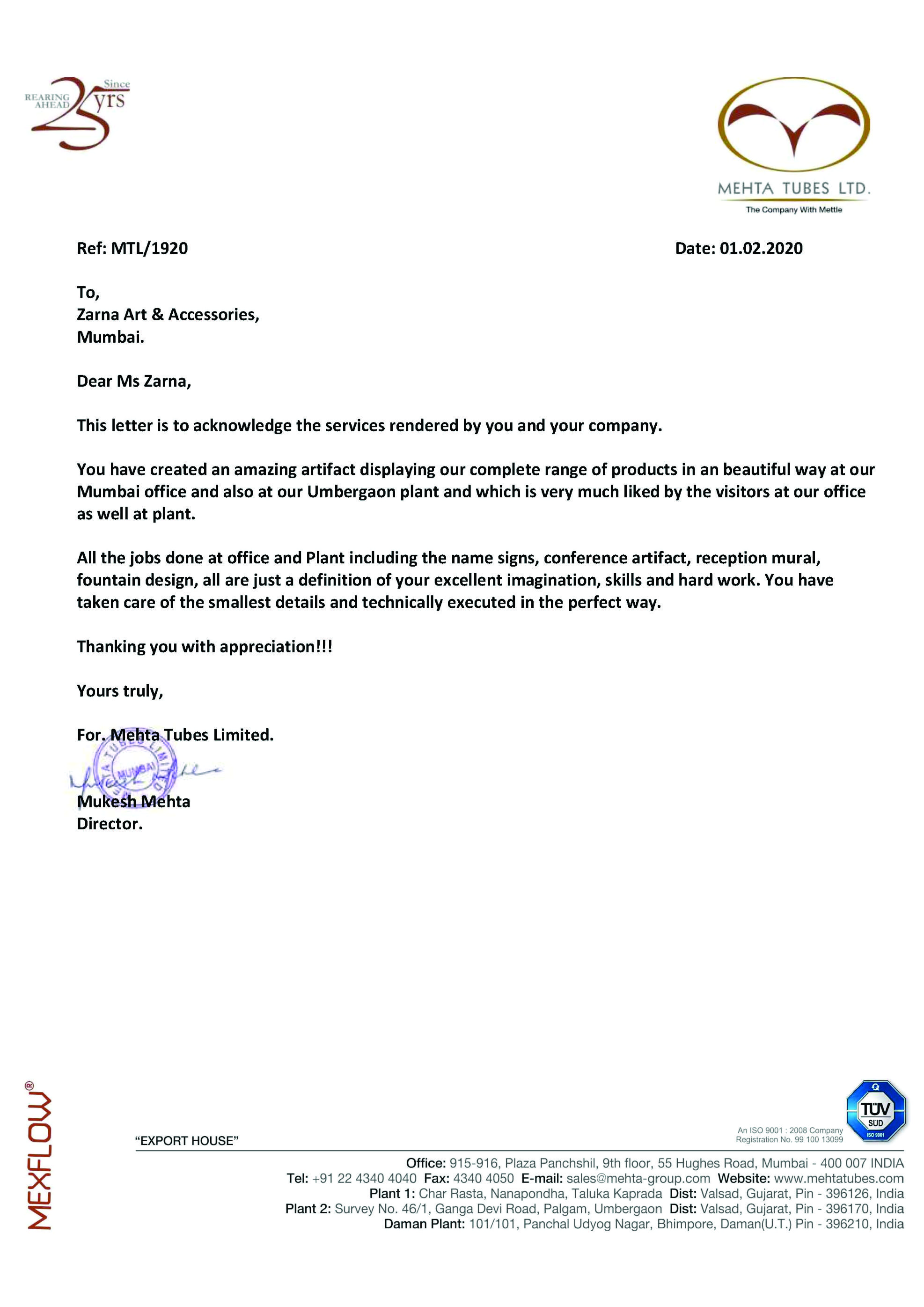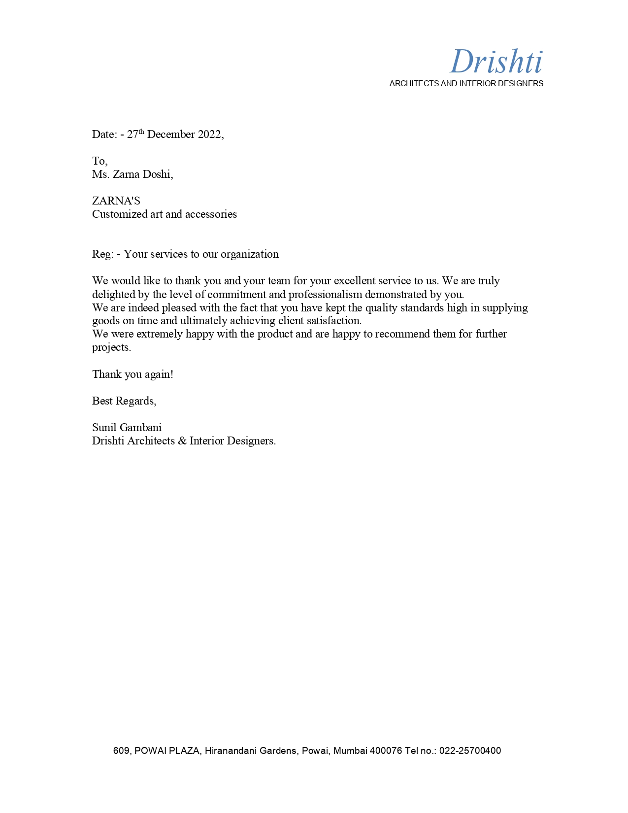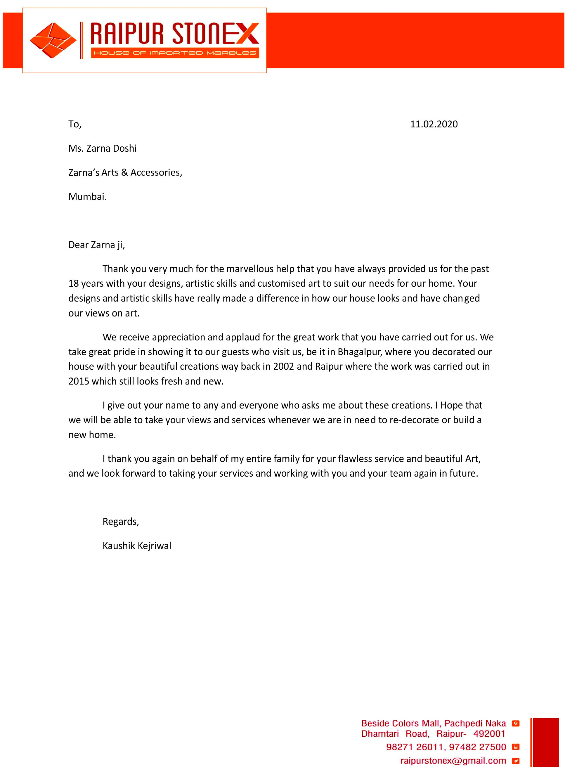 This is to express our great satisfaction and appreciation for ZARNA'S Customised Mirrors done for Encasa which were highly appreciated by our customers also.