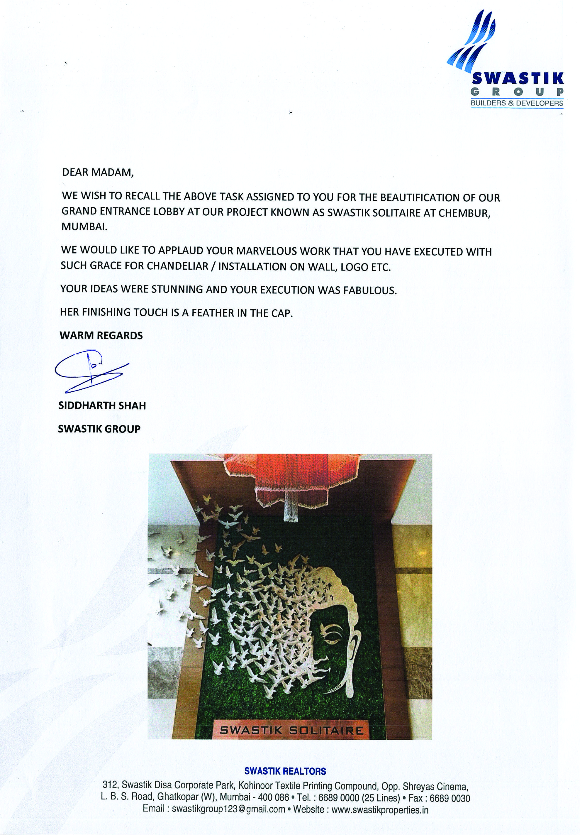 You have created a marvelous Artifact installed in my Valsad office and my residence in Mumbai.