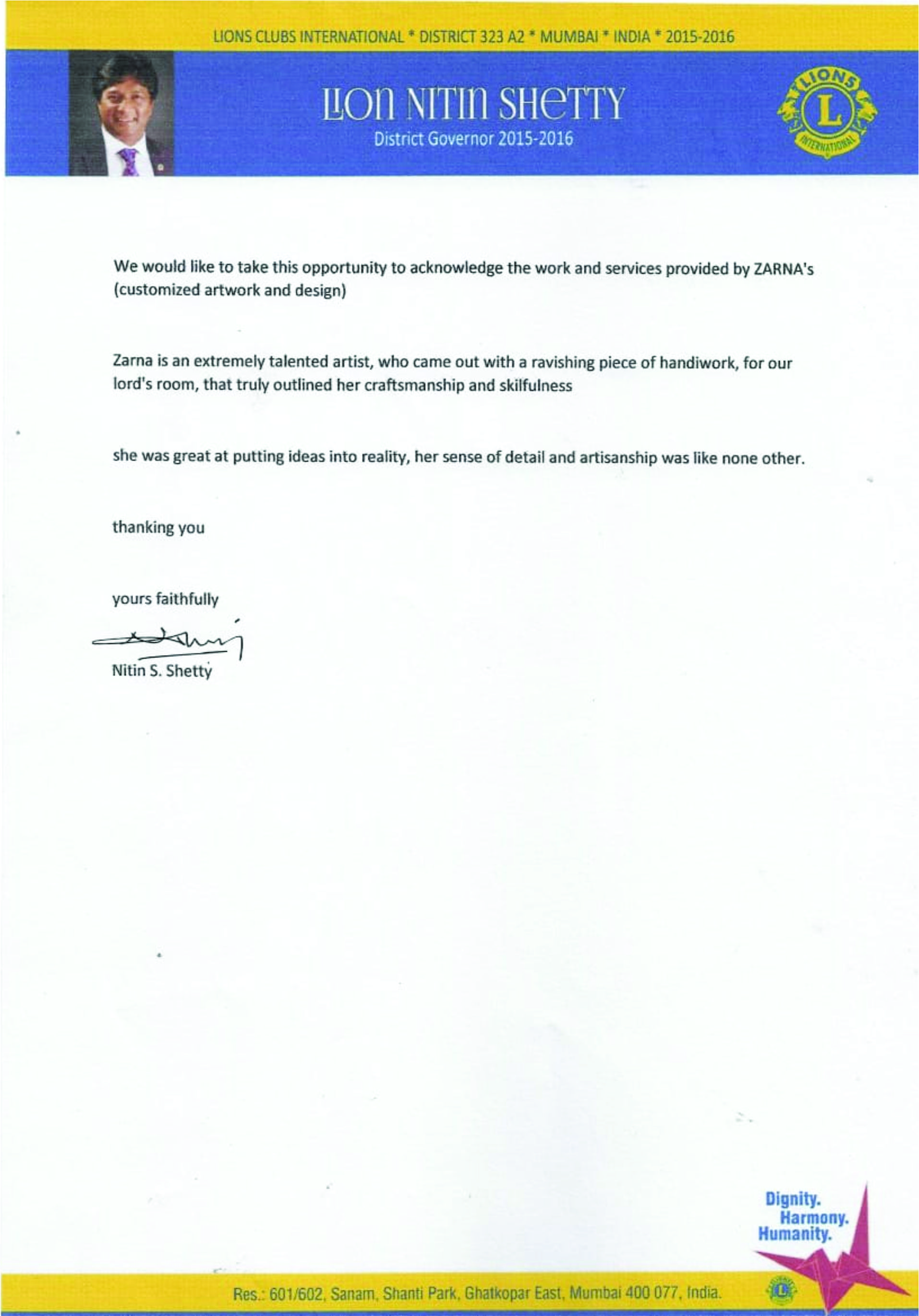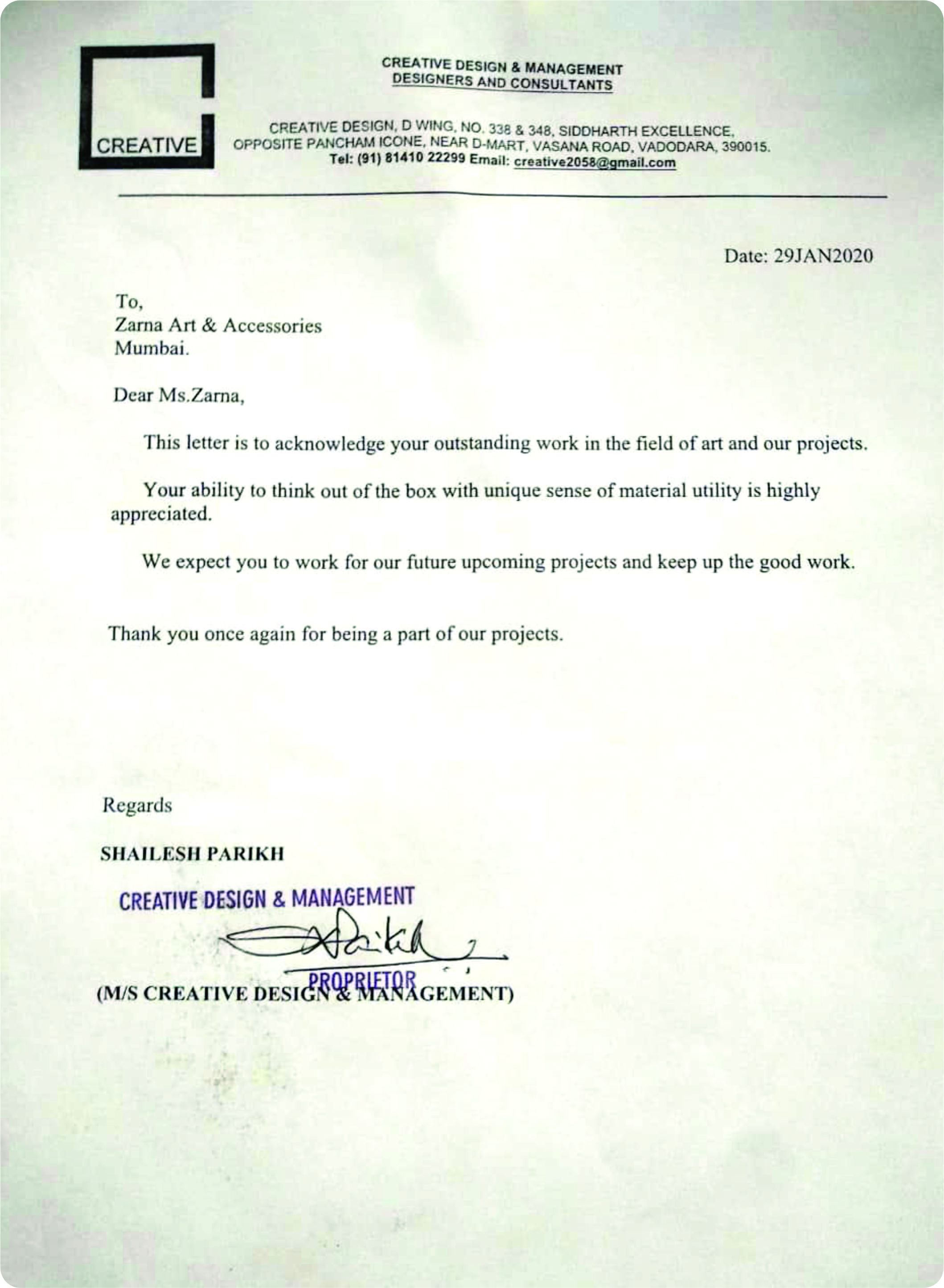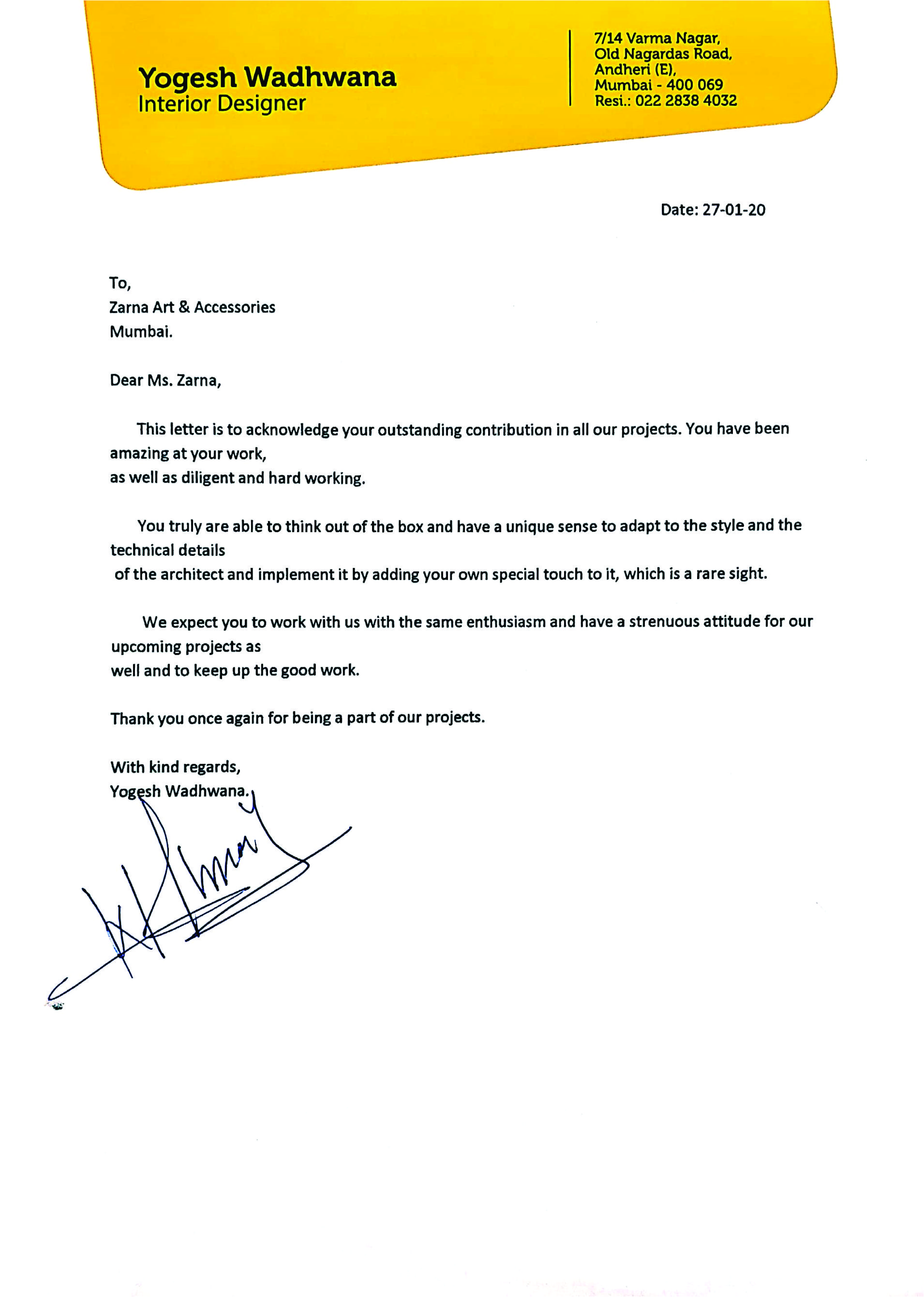 we appreciate and thank Zarna for her creative outputs for our residence.