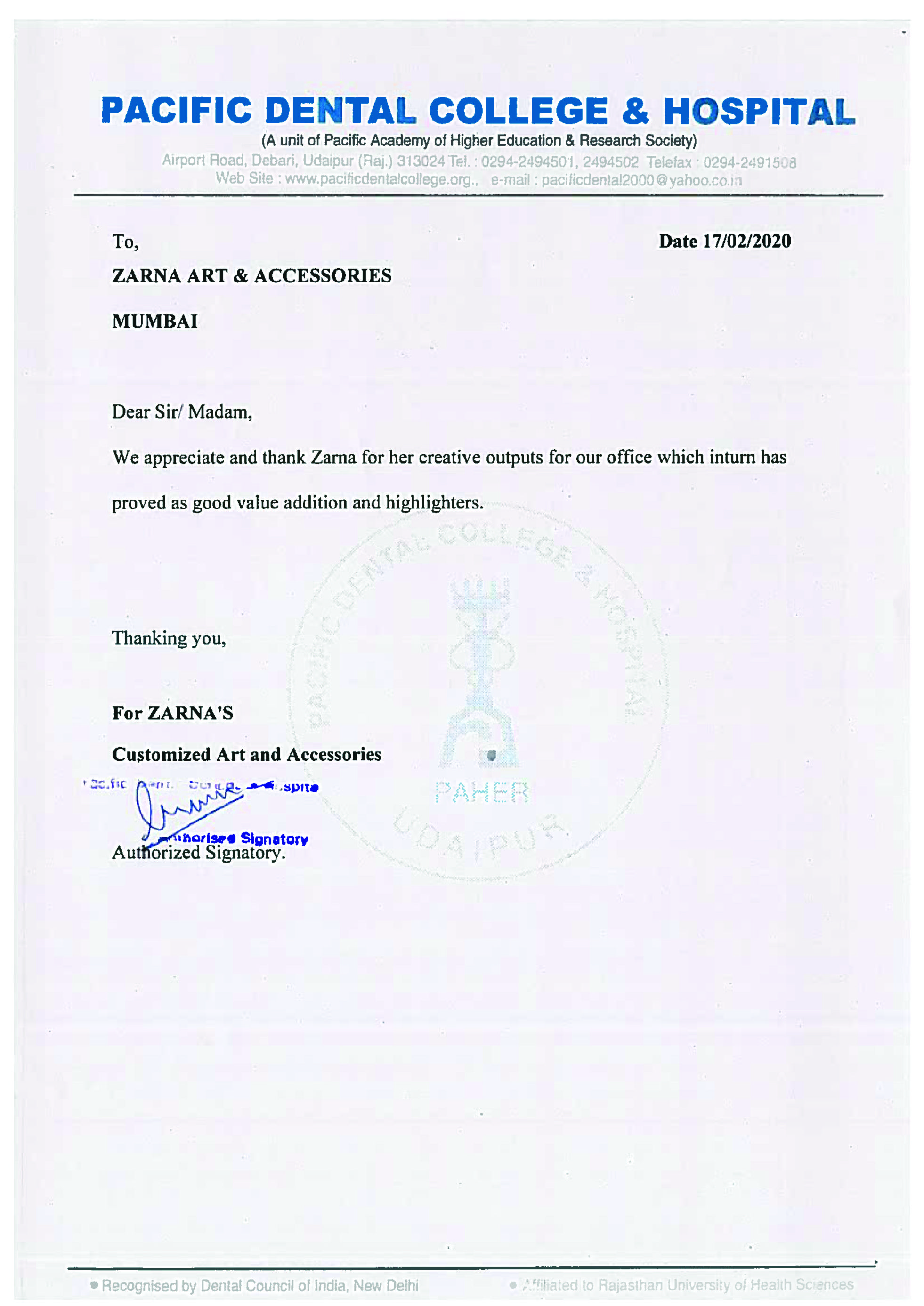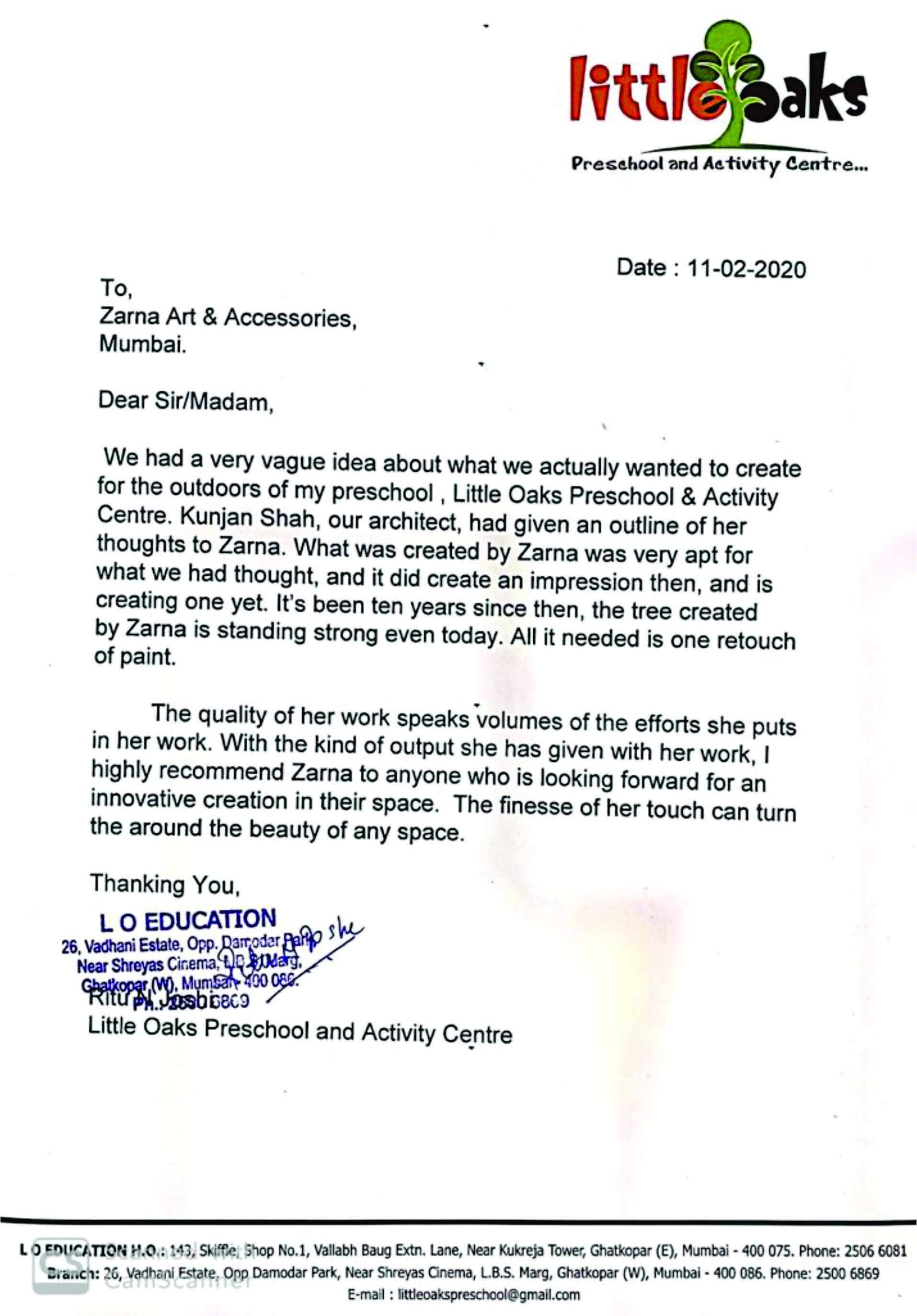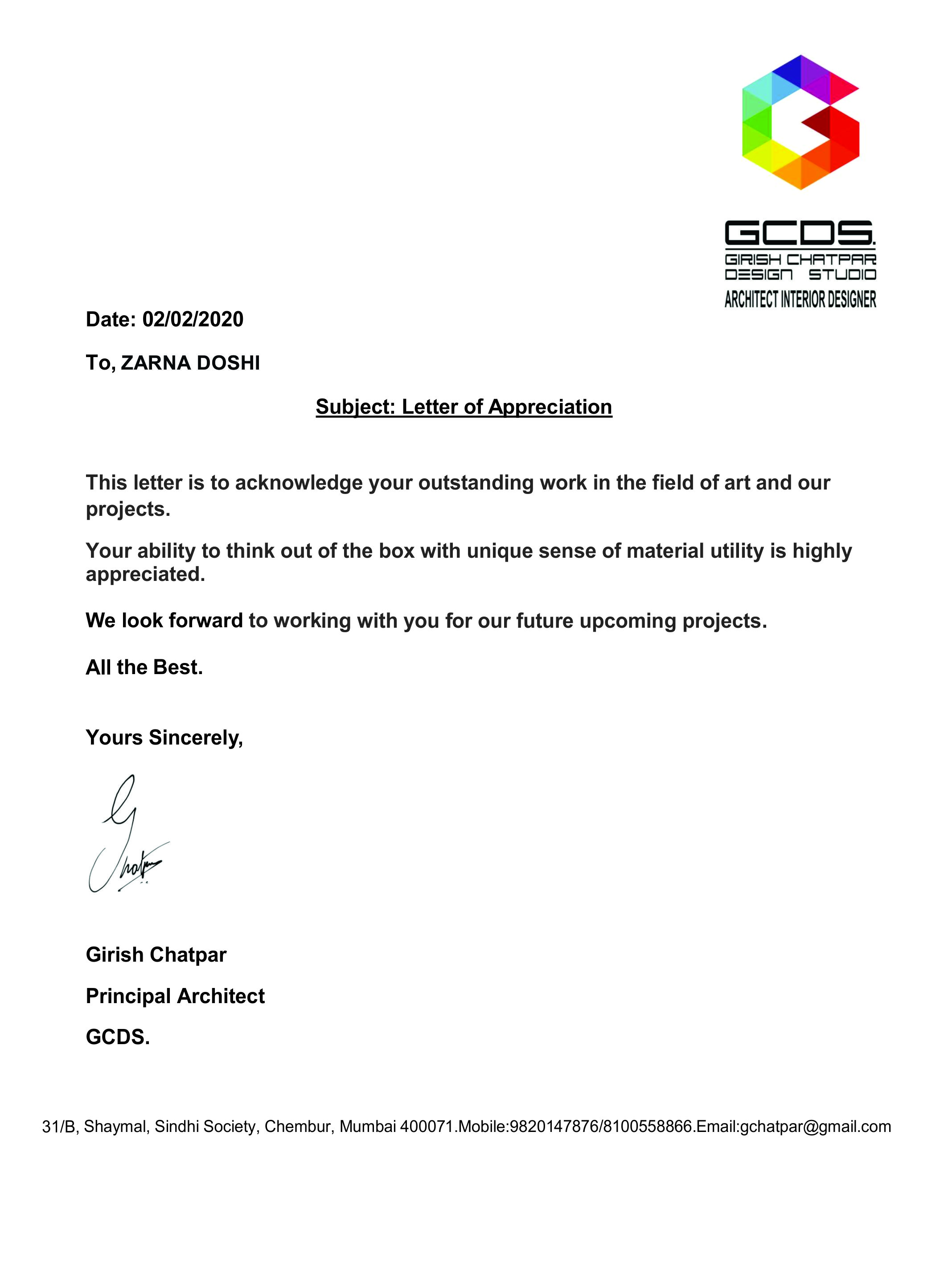 we appreciate and thank Zarna for her creative outputs for our residence.