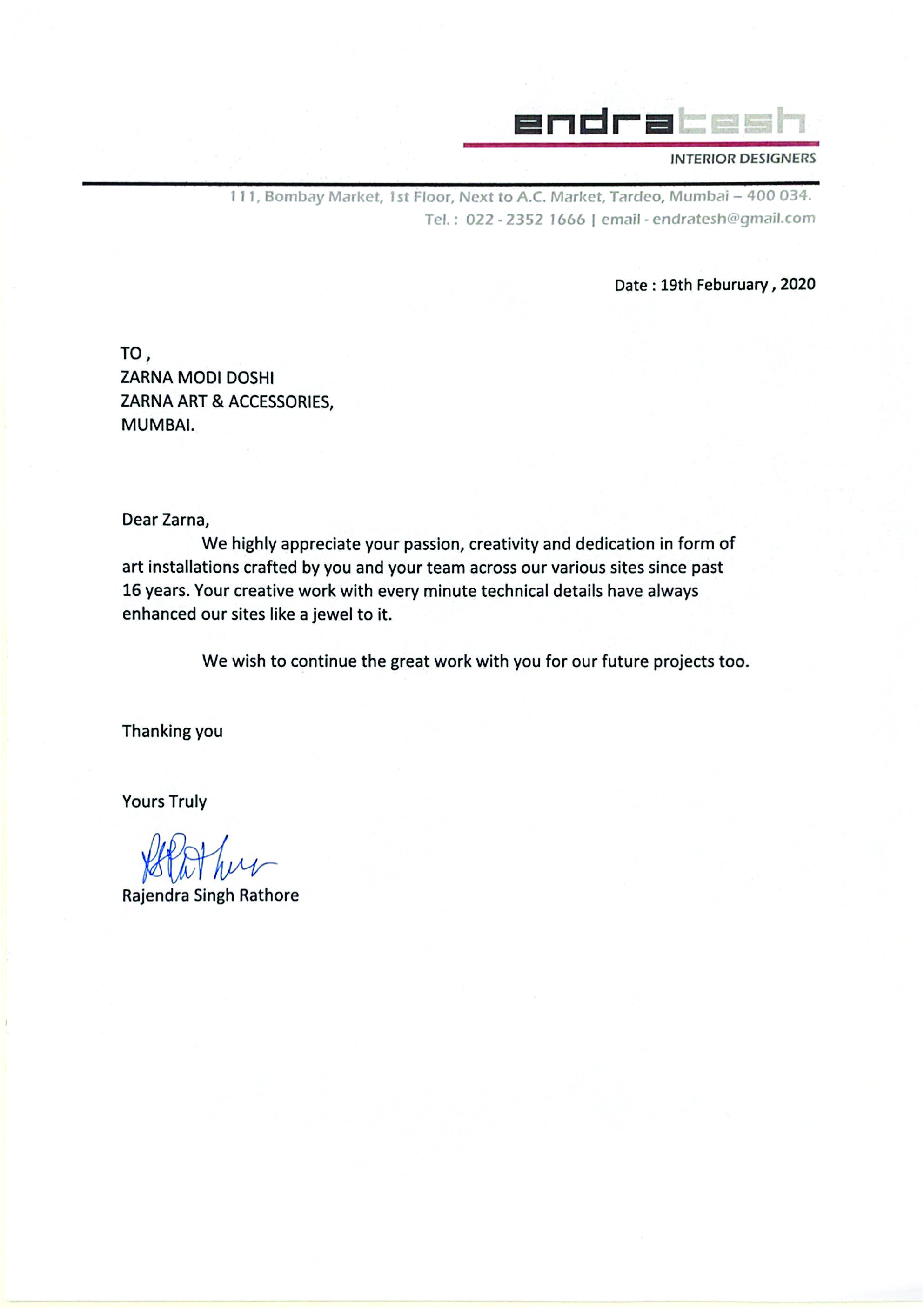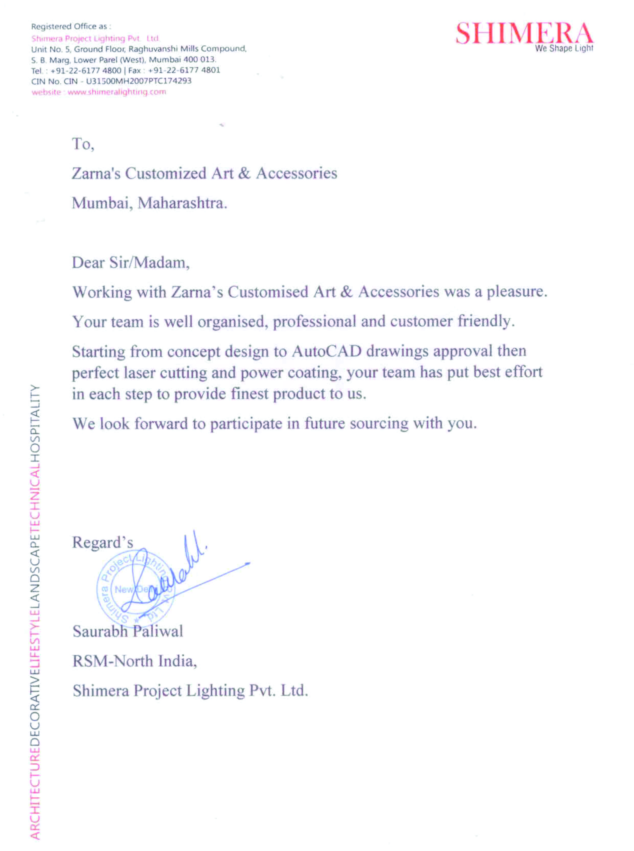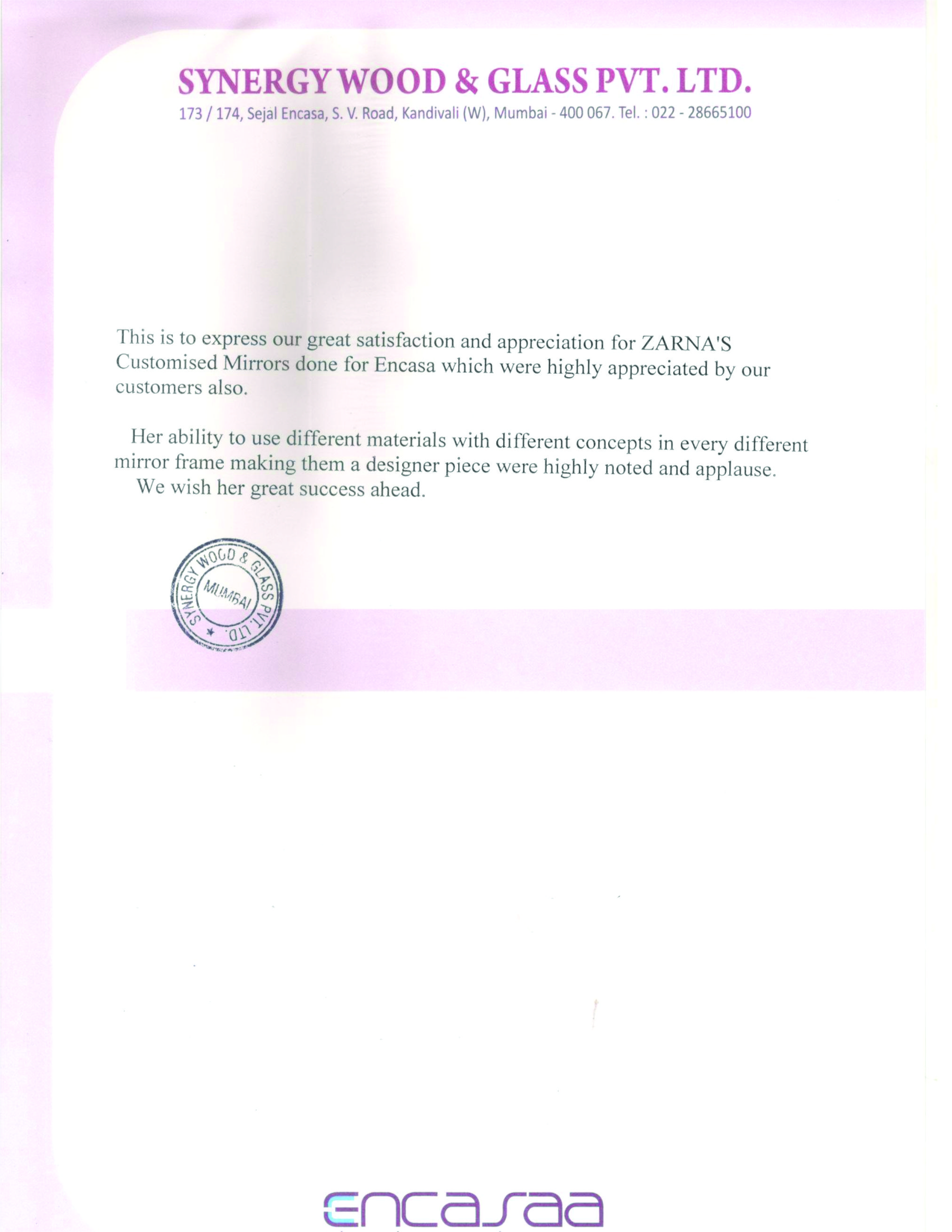 This is to express our great satisfaction and appreciation for ZARNA'S Customised Mirrors done for Encasa which were highly appreciated by our customers also.