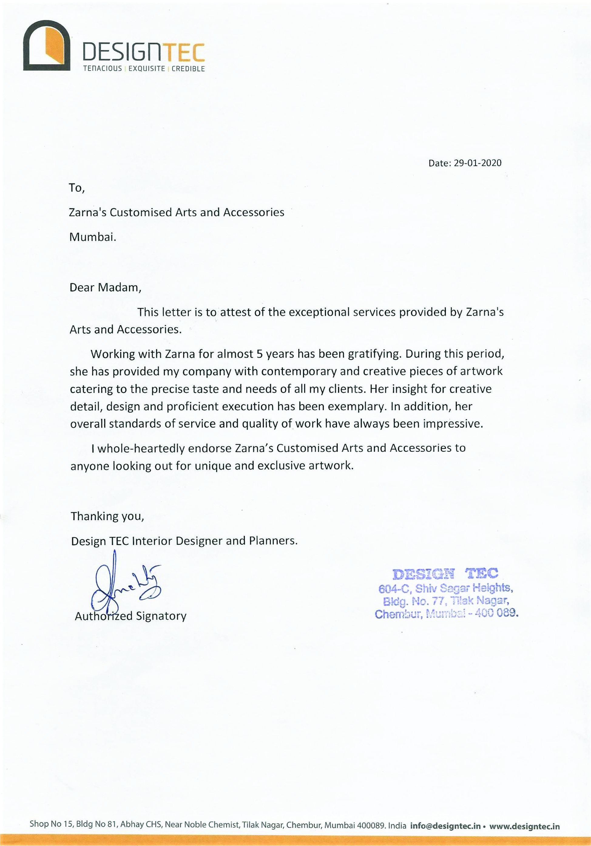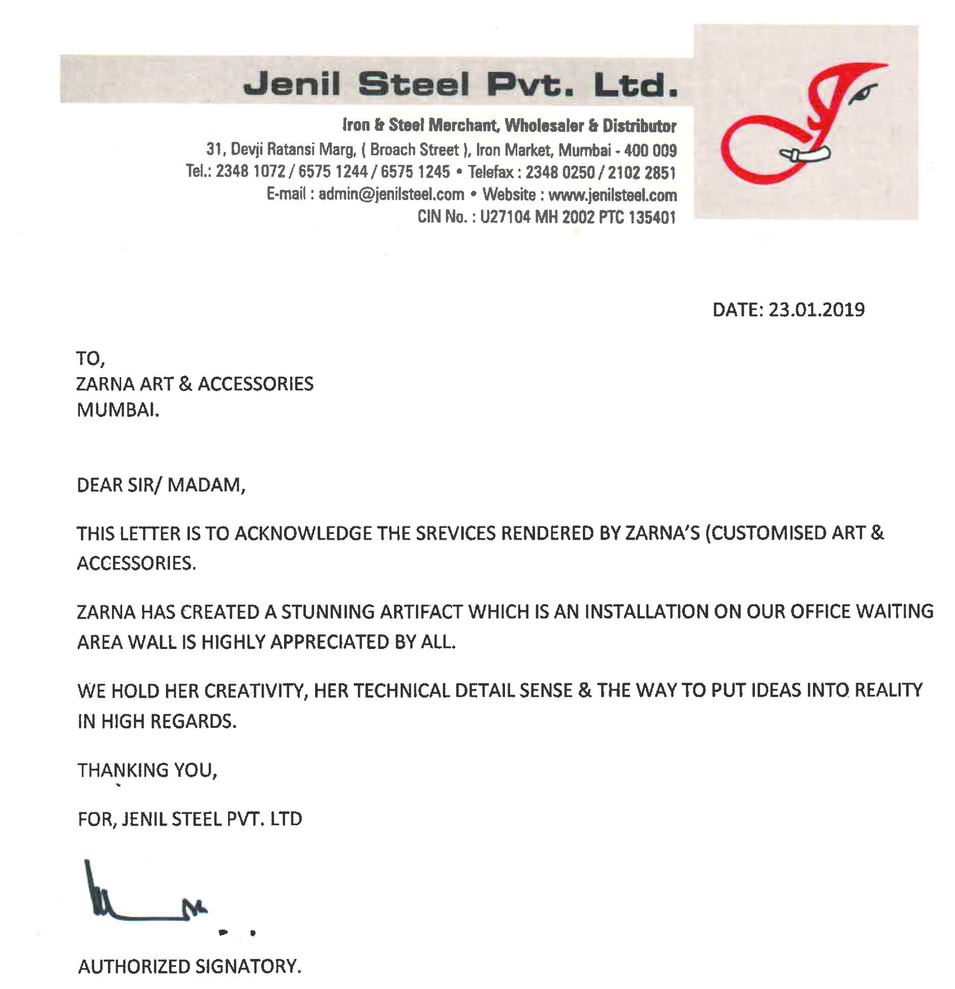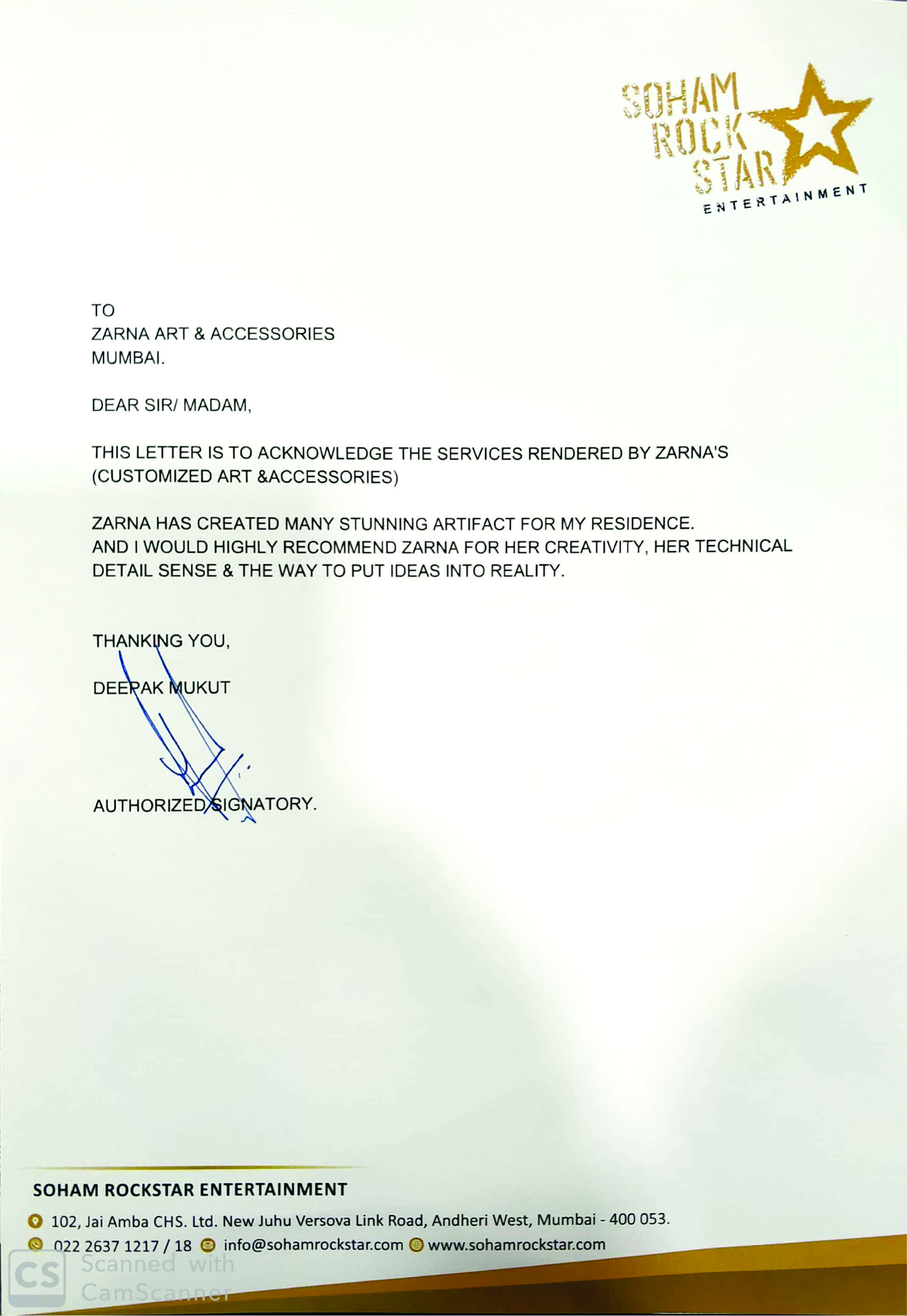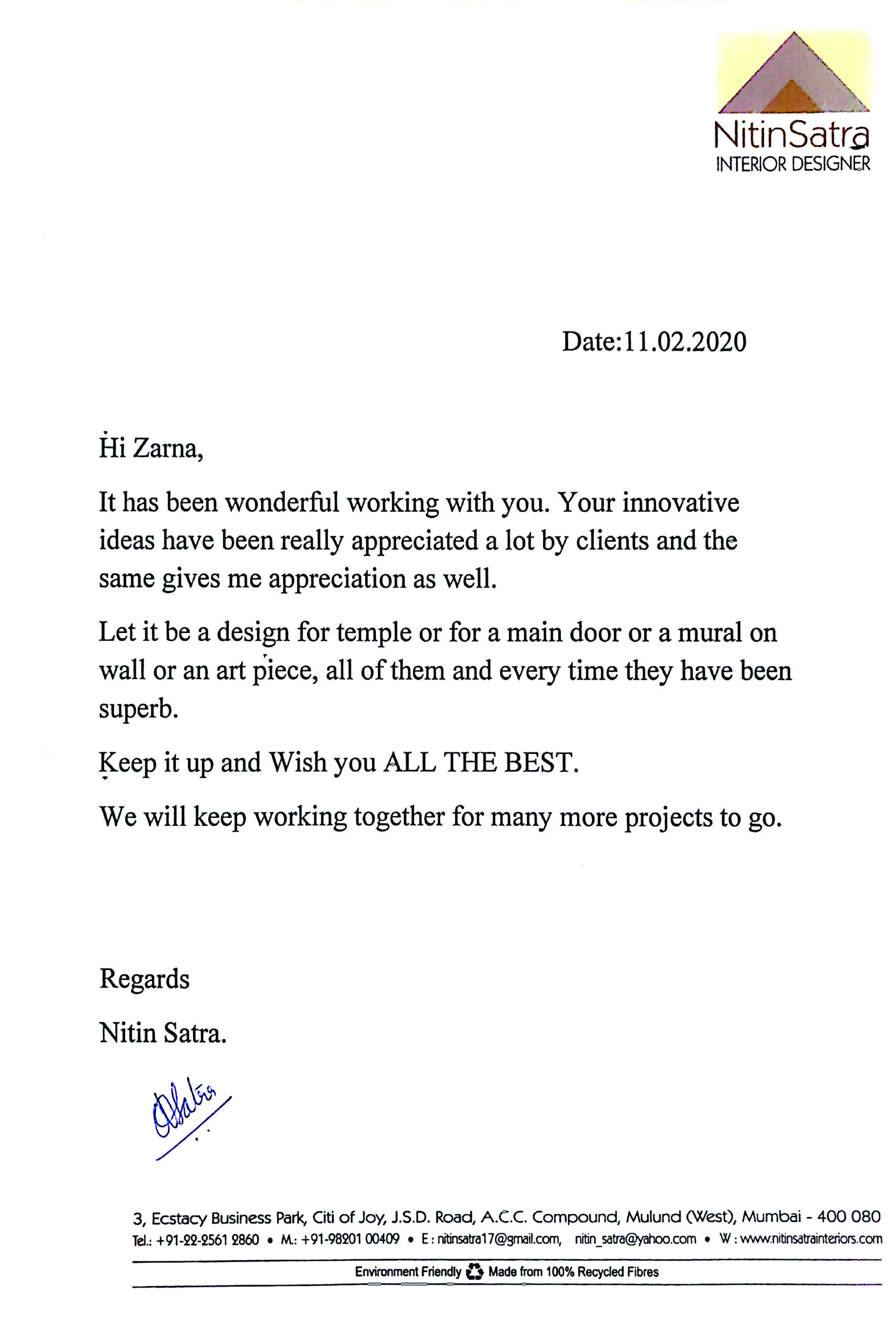 This is to express our great satisfaction and appreciation for ZARNA'S Customised Mirrors done for Encasa which were highly appreciated by our customers also.