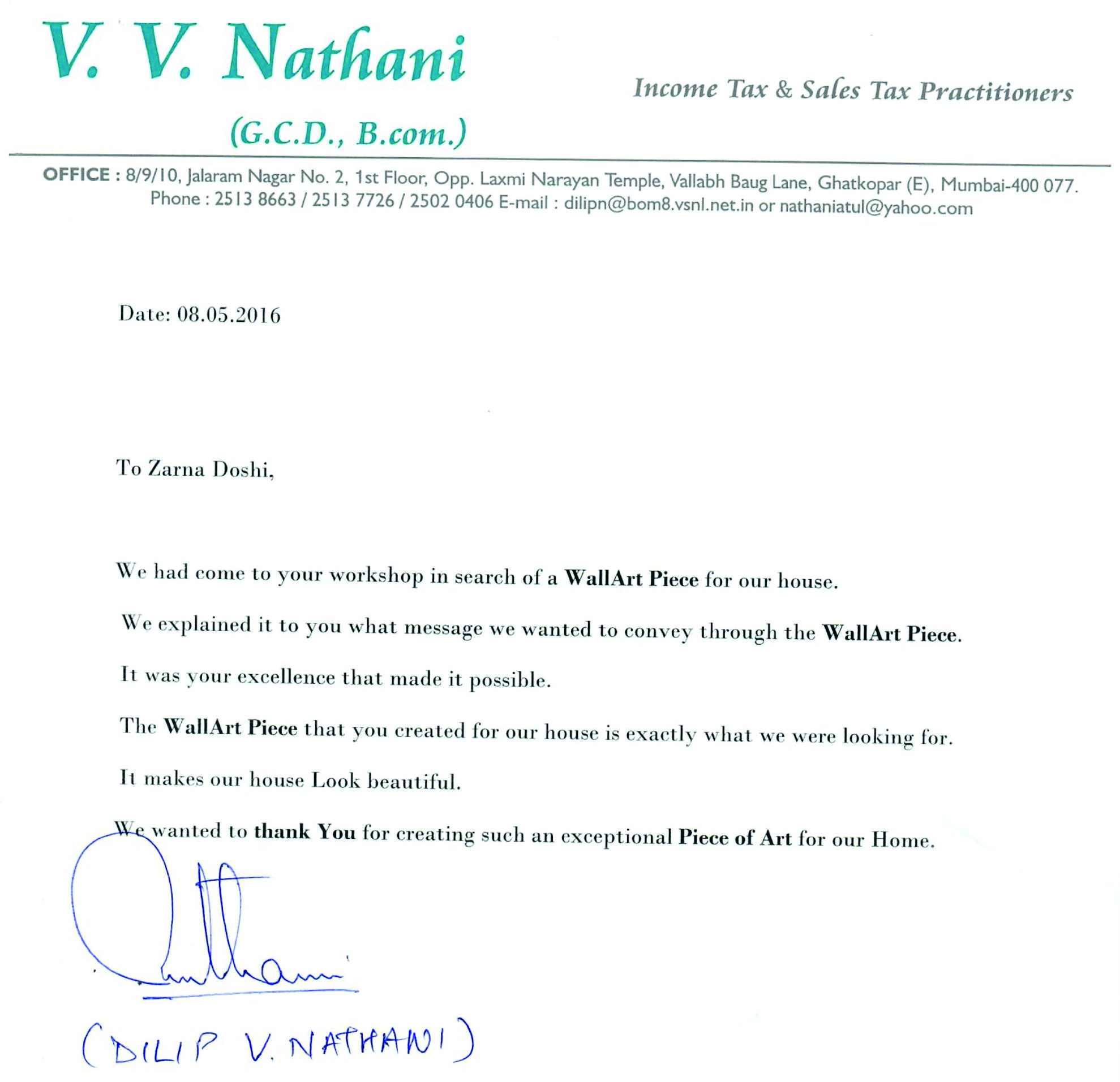You have created a marvelous Artifact installed in my Valsad office and my residence in Mumbai.
